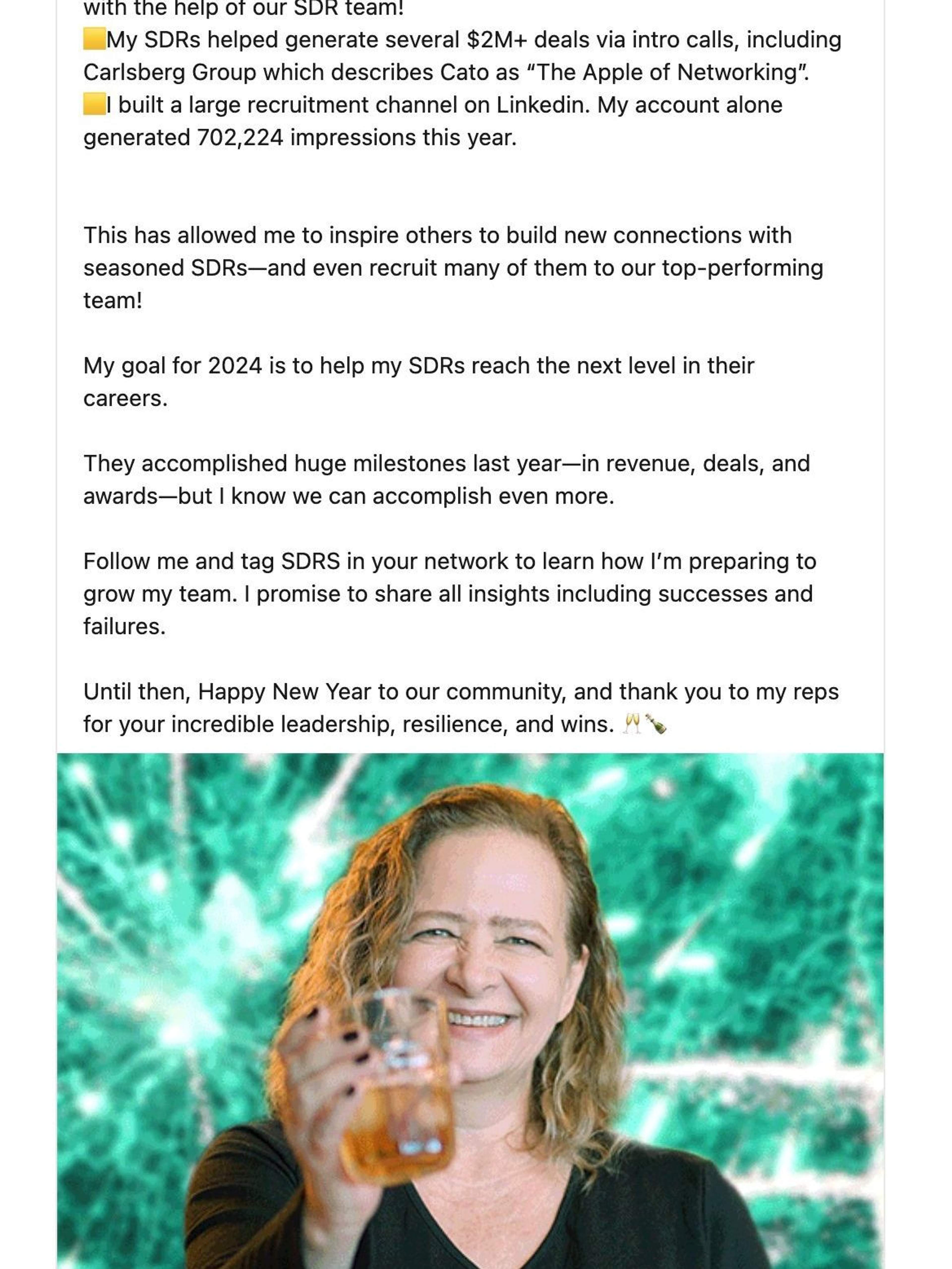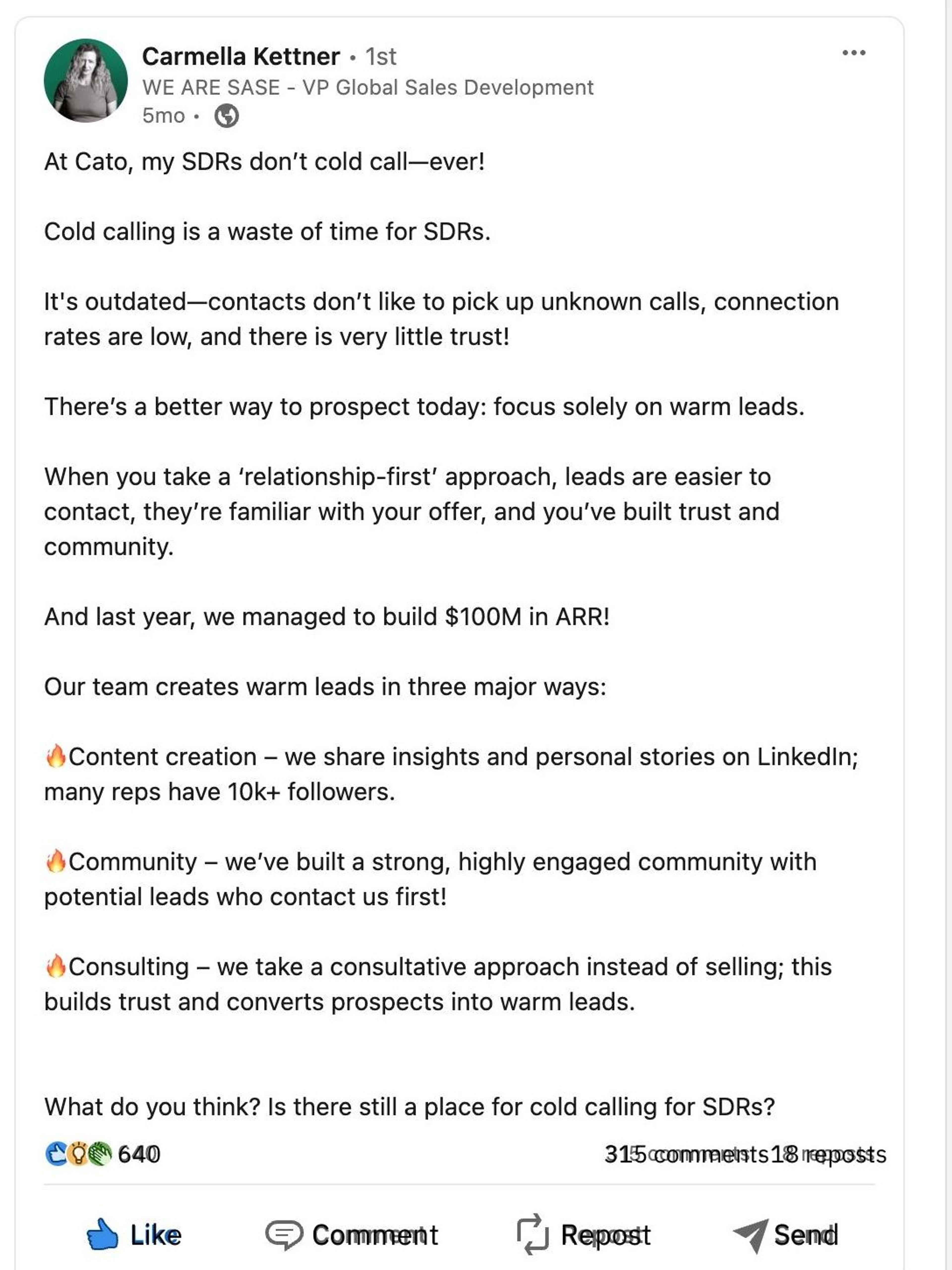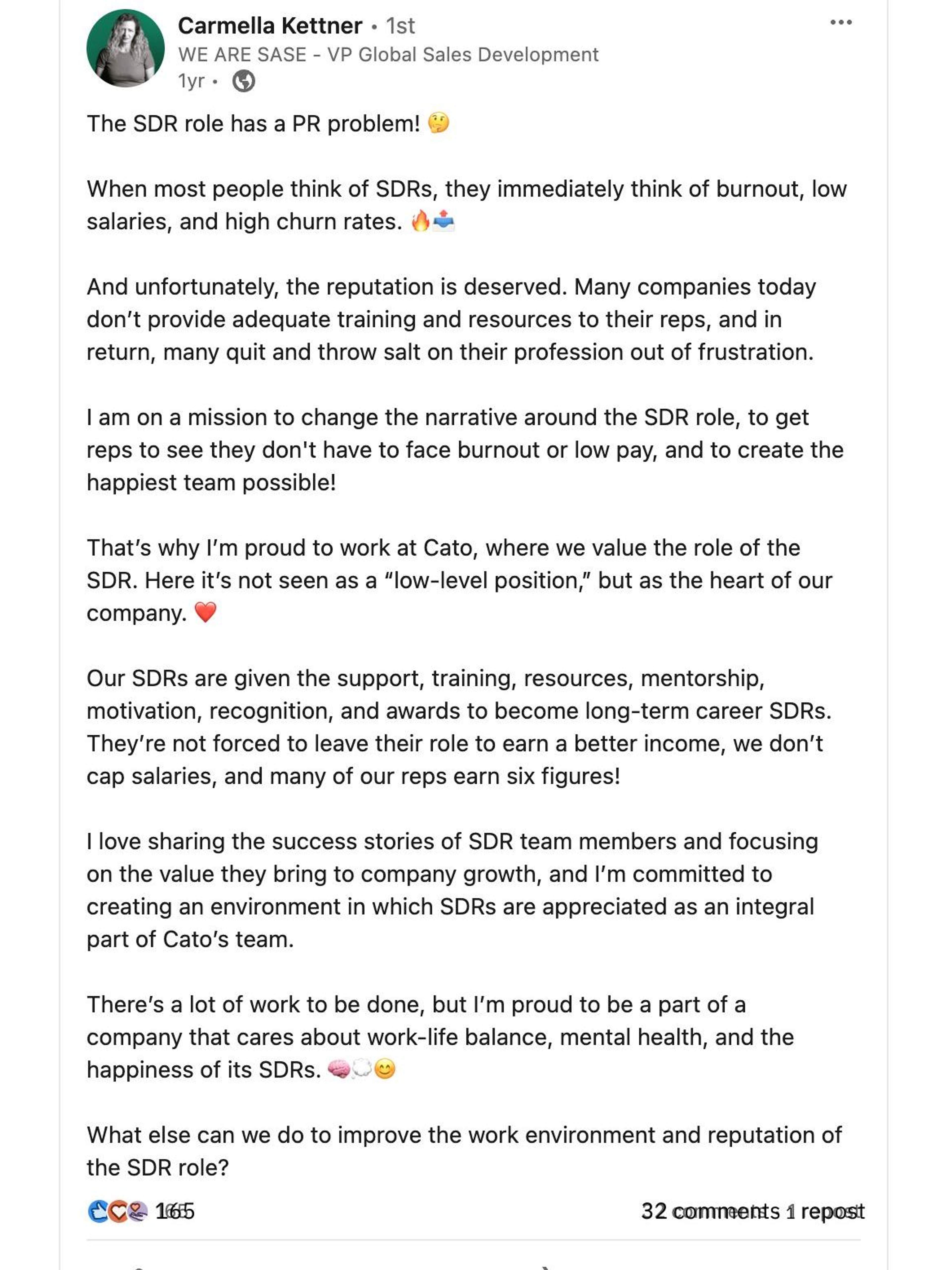 I was brought on to help scale their efforts by writing LinkedIn thought leadership content for key leaders, primarily Carmella Kettner, Vice President of Global Sales Development.